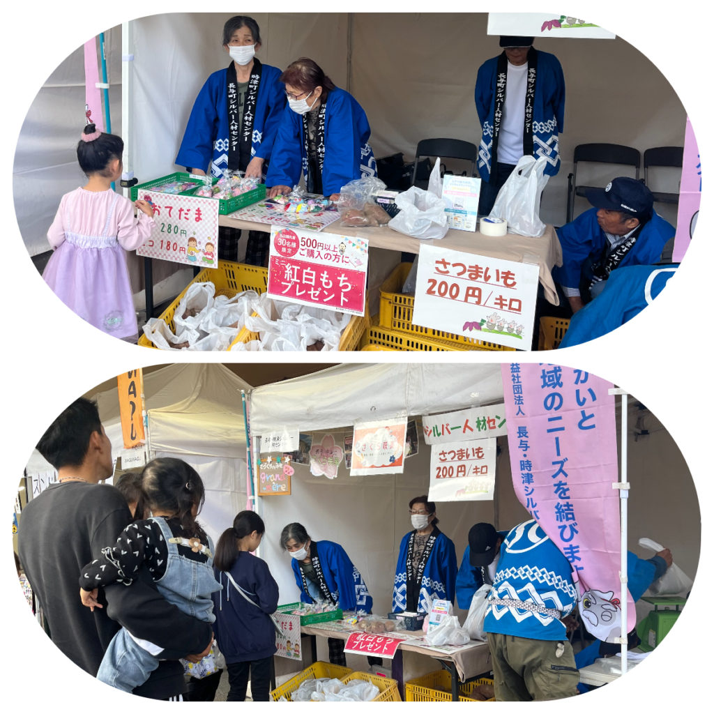 先月、イオンチアーズクラブの皆さんと一緒に収穫したサツマイモと、女性の会「さくら咲楽」で作成したお手玉を販売しました🎪