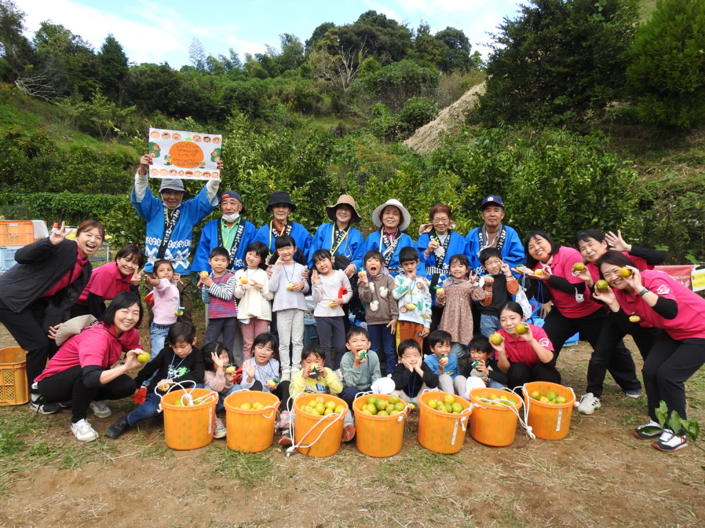 年長クラスの17名の園児の皆さんは元気いっぱい!会員がお手伝いしながら、バケツいっぱいにみかんを収穫していました🪣